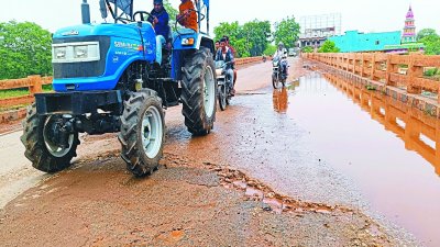 Dilapidated bridge बालोद जिला मुख्यालय में भले ही नेशनल हाइवे की सड़क का निर्माण हो रहा हो लेकिन शहर में प्रवेश करने से पहले गड्ढों, सरिया व उखड़े पुल से राहगीरों का स्वागत होगा। इस जर्जर पुल की मरम्मत के नाम पर भले ही खानापूर्ति जिम्मेदार विभाग द्वारा की गई हो लेकिन वर्तमान में पुल की जो स्थिति है, उससे सड़क दुर्घटना हो सकती है।