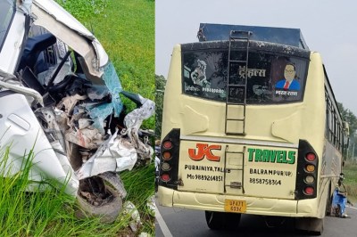 Balrampur road accident: बलरामपुर नेशनल हाईवे पर (NH-730) पर बस और कार की आमने-सामने की टक्कर में पिता पुत्र की मौत हो गई है। जबकि चार लोग गंभीर रूप से घायल हो गए हैं।
