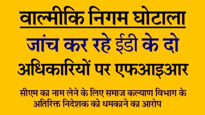 बेंगलूरु. एक वरिष्ठ सरकारी अधिकारी पर वाल्मीकि निगम घोटाले में गिरफ्तार पूर्व कांग्रेस मंत्री बी. नागेंद्र और मुख्यमंत्री सिद्धारमैया का नाम लेने के लिए दबाव डालने के आरोप में यहां प्रवर्तन निदेशालय (ईडी) के दो अधिकारियों के खिलाफ मामला दर्ज किया गया है। समाज कल्याण विभाग के अतिरिक्त निदेशक कल्लेश बी. की शिकायत के बाद सोमवार को एफआईआर दर्ज की गई।
