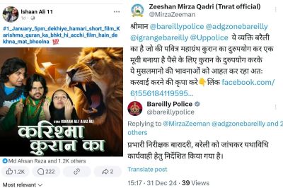 जीशान मिर्जा कादरी ने एक्स पर पोस्ट करते हुए बरेली पुलिस को लिखा है कि बारादरी क्षेत्र के हजियापुर निवासी चर्चित यूट्यूबर ईशान अली ने पवित्र महाग्रंथ कुरान का दुरुपयोग कर एक मूवी बनाई है। जिससे मुसलमानों की भावनाओं को चोट पहुंची है। इस मूवी को नाम "करिशमा कुरान का" दिया गया है। यह मूवी 1 जनवरी यानि बुधवार को शाम 5 बजे ईशान के चैनल से पोस्ट की जाएगी। इसका पोस्टर ईशान अली फेसबुक आईडी संख्या 61556184119595 से अपलोड किया गया है। जीशान मिर्जा कादरी ने ईशान अली पर कार्रवाई की मांग की है।