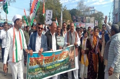 अरावली पर्वतमाला के संरक्षण और मनरेगा योजना को कमजोर किए जाने के विरोध में शनिवार को भीलवाड़ा शहर जिला कांग्रेस कमेटी ने हुंकार भरी। शहर जिलाध्यक्ष शिवराम (जीपी) खटीक के नेतृत्व में कार्यकर्ताओं ने जन-जागरण रैली निकाली और सिटी कंट्रोल रूम के बाहर केंद्र व राज्य सरकार के खिलाफ जमकर नारेबाजी की। प्रदर्शन के बाद राष्ट्रपति के नाम एक ज्ञापन भीलवाड़ा तहसीलदार नीरज रावत को सौंपा गया।