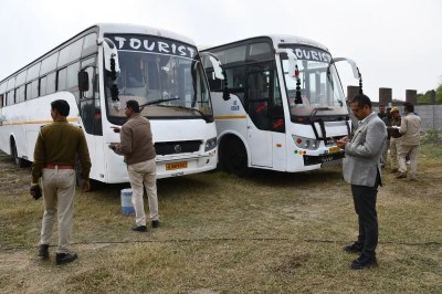 खेत की आड़ में रखी थी दो बसें, पकड़े जाने पर चालान