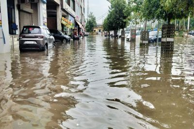 भिवाड़ी. उद्योग क्षेत्र में बुधवार दोपहर 12 से ढाई बजे तक झमाझम बारिश हुई। एक बार बारिश का सिलसिला शुरू हुआ तो निरंतर चलता ही रहा। करीब ढाई घंटे तक आसमान से राहत बरसती रही। आसमान में घने काले बादल छाए रहे। दिन में भी अंधेरा हो गया। तेज धमाके के साथ बिजली कडक़ी। बारिश से मौसम सुहावना हो गया, जो जहां था वहीं रुक गया। सरकारी आंकड़ों अनुसार ढाई घंटे में छह इंच बारिश होना बताया जा रहा है। बारिश रुकी तो बीडा, नगर परिषद, रीको ने जलभराव दूर करने के प्रयास शुरू किए लेकिन पानी का प्रवाह इतना तेज था कि सारे प्रयास नाकाफी रहे। क्षेत्र में स्थित हर एक भूखंड तालाब बन गया। खाली भूखंड तालाब बनने के बाद उफान मारने लगे। चारों तरफ रोड पर कई-कई फीट तक पानी नजर आया। सडक़ नहर बन गई। दोपहर को स्कूलों की छुट्टी हुई तो स्कूली बसों को बच्चों को छोडऩे में कई घंटे का विलंब हो गया।