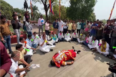 MP News : मुख्यमंत्री लाडली बहना योजना, परिवहन विभाग घोटाला समेत भ्रष्टाचार के कई मुद्दों को लेकर कांग्रेस ने विरोध जताया। कांग्रेस विधायक दिनेश जैन कुंभकरण बनकर गांधी प्रतीमा के पास लेट गए। साथ ही नेता प्रतिपक्ष उमंग सिंघार समेत अन्य कांग्रेसी बीन बजाकर कुंभकरण बने विधायक को नींद से उठाते नजर आए।