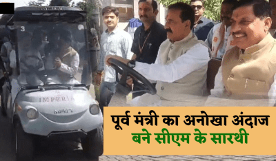 ग्वालियर के इम्पीरियल रिसॉर्ट में प्रबुद्ध जनों की बैठक रखी गई थी। सीएम डॉ. मोहन यादव जैसे ही बैठक को संबोधित करने रिसॉर्ट पहुंचे, पूर्व मंत्री डॉ.नरोत्तम मिश्रा ने उनका स्वागत किया और उन्हें गोल्फ कार्ट (इलेक्ट्रिक व्हीकल) में बैठाया। इसके बाद डॉ.नरोत्तम मिश्रा ने खुद स्टीयरिंग संभाल ली और मुख्यमंत्री को ई कार्ट से घुमाते हुए बैठक स्थल पर ले गए। सीएम डॉ. मोहन यादव पूर्व गृह मंत्री नरोत्तम मिश्रा के साथ ई कार्ट की सवारी करते हुए ही कार्यक्रम स्थल तक पहुंचे।