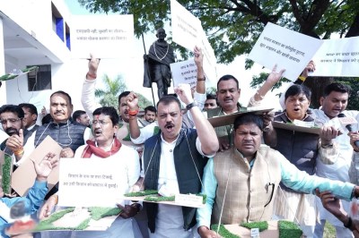 विधानसभा के शीतकालीन सत्र के दूसरे दिन भी विपक्ष का हंगामेदार रवैय्या देखने को मिला। गांधी प्रतिमा के सामने किसानों के मुद्दों को लेकर कांग्रेस ने जोरदार प्रदर्शन किया। इस दौरान कांग्रेस विधायकों के हाथों में अलग-अलग तख्तियां थीं, जिनपर लिखा था- 'किसानों की चिड़िया बन खेत चुग रही सरकार', अन्य पोस्टर में लिखा था 'किसान के नाम पर सत्ता टिकाई, अब उसी किसान को भावांतर में डुबाई' और 'मिट्टी में मिला सरकारी सपना, कर्ज में डूबता किसान अपना।'
