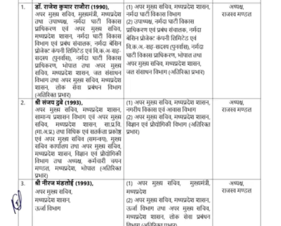 सामान्य प्रशासन विभाग से जारी ट्रांसफर आदेश के अनुसार संजय कुमार शुक्ल को सामान्य प्रशासन विभाग में अपर मुख्य सचिव, डीपी आहूजा को सहकारिता विभाग का प्रमुख सचिव, एम सेल्वेंद्रन को सामान्य प्रशासन विभाग में कार्मिक सचिव, निशांत बरबडे को किसान कल्याण विभाग का सचिव, प्रबल सिपाहा को उच्च शिक्षा आयुक्त, राखी सहाय को मध्यप्रदेश लोक सेवा आयोग का सचिव बनाया गया है।