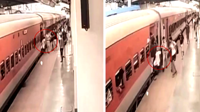 प्लेटफॉर्म से छूट चुकी ट्रेन पर चढ़ते समय गिरते-गिरते बची महिला, GRP के जवान ने खुद की जान पर खेलकर महिला को बचाया। प्लेटफॉर्म के सीसीटीवी कैमरे में कैद हुई घटना।