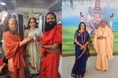 पहली तस्वीर में हेमा महा मंडलेश्वर अवधेशानंद के साथ खड़ी थीं। एक अन्य तस्वीर में, हेमा योग गुरु रामदेव और चिदानंद सरस्वती के साथ हैं।