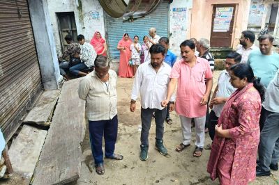 शहर के सदर बाजार में नालियों का पानी नींव में रिसने से पांच दुकानों में दरारें आने से झुक गई।