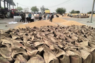 स्थानीय कृषि उपज मंडी में भारतीय खाद्य निगम द्वारा संचालित समर्थन मूल्य गेहूं खरीद केंद्र पर बारदाना खत्म हो जाने से गेहूं लेकर आए किसानों को परेशानी का सामना करना पड़ रहा था।