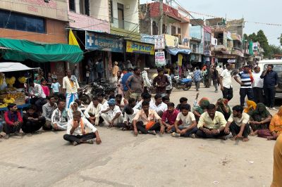 शव सुपुर्द किए जाने के बाद मुआवजे की मांग को लेकर कस्बे के मुख्य