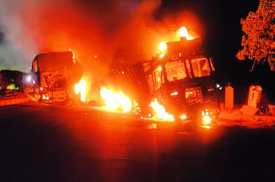 जानकारी के अनुसार अहिंसा सर्किल के पास स्थित सेण्ड स्टोन के स्टॉक से एक ट्रक भरकर हाइवे पर आया। हाइवे पर चढकऱ घूमते समय पीछे से कोटा की ओर से आ रहे ट्रेलर चालक ने अचानक ब्रेक लगाए, जिससे ट्रेलर असन्तुलित ट्रक से जा टकराया। दुर्घटना में ट्रेलर के टायर फटने से आग लग गई। इस दौरान ट्रक के डीजल टेंक ने आग पकड़ ली। देखते ही देखते ट्रक व ट्रेलर धूं धुं कर जलने लगे। गनीमत रही इस बीच ट्रक व ट्रेलर के चालक व खलासी बाहर निकलने में कामयाब रहे। जिससे कोई जनहानि नहीं हुई।