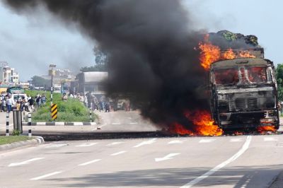 सदर थाना पुलिस ने बताया कि रामगंजबालाजी तिराहे पर अलोद निवासी आबिद (35) पुत्र शराफत बाइक से सडक़ पार कर रहा था। इस दौरान सामने से आ रहे ट्रक चालक ने बाइक के टक्कर मार दी, जिससे आबिद बाइक से उछलकर दूर गिर पड़ा। वहीं बाइक ट्रक के अगले हिस्से में फंस जाने के बाद में लगभग 50 मीटर तक घिसती हुए जाने से निकली ङ्क्षचगारी से ट्रक ने आग पकड़ ली। आधे घंटे मे ट्रक व बाइक जलकर राख हो गया। वाहनों में लगी आग से हाइवे पर दोनों ओर वाहनों की कतार लगना शुरू हो गया।