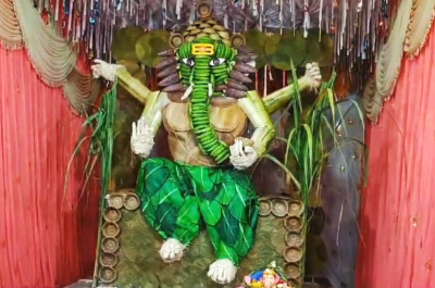 प्रदूषण रोकने का संदेश देते हुए इस मंडल ने इस साल केले के पत्तों (Banana Leaves) और केले के रेशे (Banana Fibres) से बनी गणेश प्रतिमा स्थापित की है।