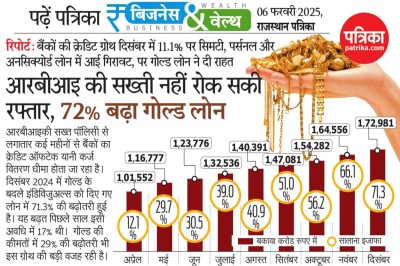 दिसंबर 2024 में गोल्ड के बदले इंडिविजुअल्स को दिए गए लोन में 71.3 प्रतिशत की बढ़ोतरी हुई है। यह बढ़त पिछले साल इसी अवधि में 17 प्रतिशत थी। बैंकों के अनुसार, इस तेज ग्रोथ का करीब आधा हिस्सा गोल्ड लोन को एग्री-गोल्ड लोन से रिटेल लोन में ट्रांसफर करने से हुआ है। रिटेल लोन में ज्यादा लिमिट मिलने के कारण बैंकों ने यह री-क्लासिफिकेशन किया। इसके साथ ही, गोल्ड की कीमतों में 29 प्रतिशत की बढ़ोतरी भी इस ग्रोथ की बड़ी वजह रही है। एग्रीकल्चर लोन में दिसंबर 2024 में 12.5 प्रतिशत की ग्रोथ दर्ज हुई, जबकि पिछले साल इसी अवधि में यह 19.4 प्रतिशत थी।