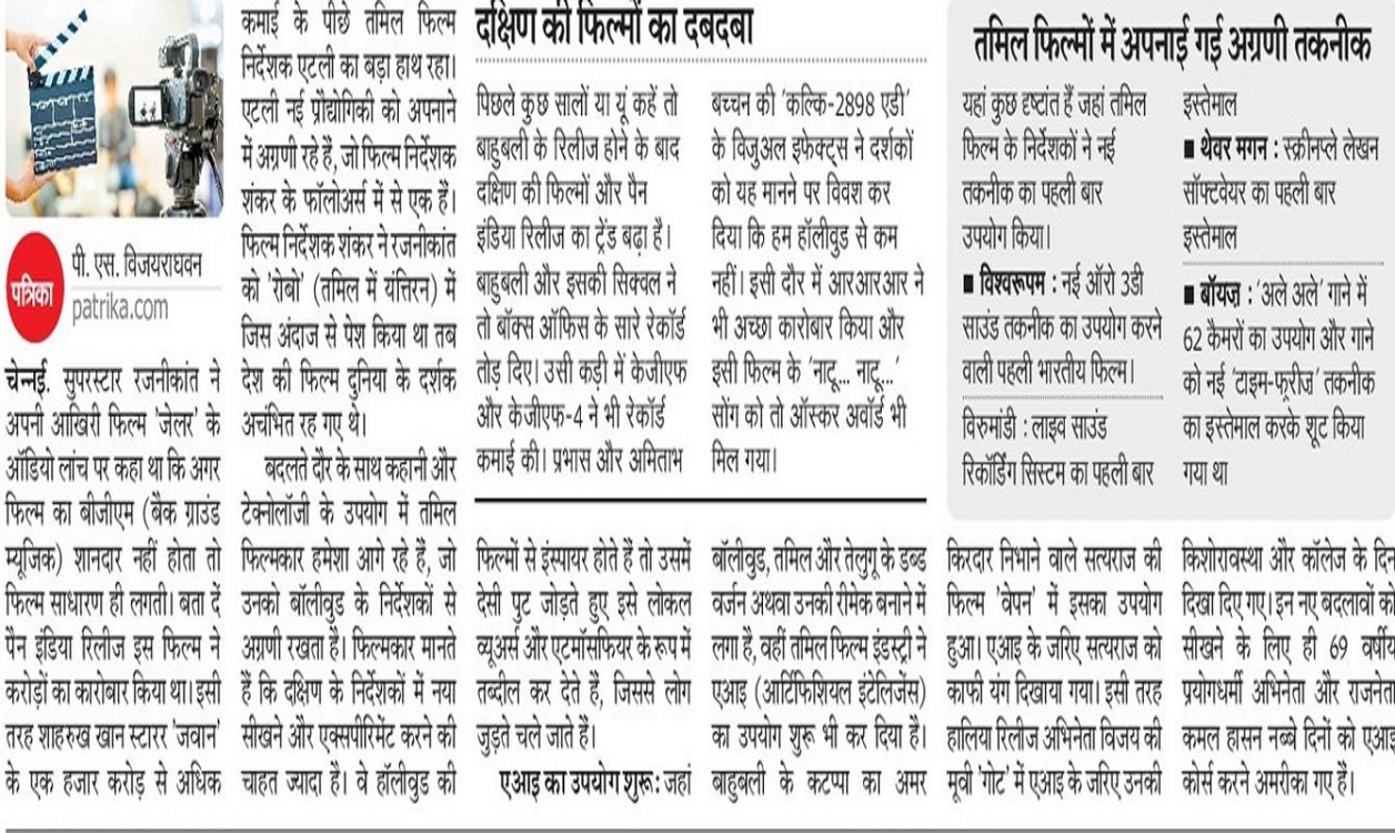 चेन्नई. सुपरस्टार रजनीकांत ने अपनी आखिरी फिल्म ’जेलर’ के ऑडियो लांच पर कहा था कि अगर फिल्म का बीजीएम (बैक ग्राउंड यूजिक) शानदार नहीं होता तो फिल्म साधारण ही लगती। बता दें पैन इंडिया रिलीज इस फिल्म ने करोड़ों का कारोबार किया था। इसी तरह शाहरुख खान स्टारर ’जवान’ के एक हजार करोड़ से अधिक कमाई के पीछे तमिल फिल्म निर्देशक एटली का बड़ा हाथ रहा। एटली नई प्रौद्योगिकी को अपनाने में अग्रणी रहे हैं, जो फिल्म निर्देशक शंकर के फॉलोअर्स में से एक हैं। फिल्म निर्देशक शंकर ने रजनीकांत को ’रोबो’ (तमिल में यंत्तिरन) में जिस अंदाज से पेश किया था तब देश की फिल्म दुनिया के दर्शक अचंभित रह गए थे।