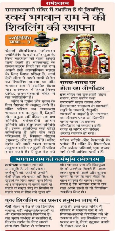 अयोध्या भगवान राम की जन्मभूमि है, तो रामेश्वरम कर्मभूमि थी, जहां से उन्होंने देवी सीता को रावण की कैद से छुड़ाने के लिए लंका कूच किया था। रामेश्वरम में लंका जाने से पहले व समुद्र सेतु के निर्माण से पहले राम ने शिव की पूजा की थी। भगवान राम की शिवपूजा के दो उल्लेख मिलते हैं, पहला लंका कूच से पहले और दूसरा रावण के वध के बाद सीता के साथ वापसी के समय। माना जाता है कि भगवान राम ने तब यहां अपने हाथों से दो शिवलिंग स्थापित किए थे।