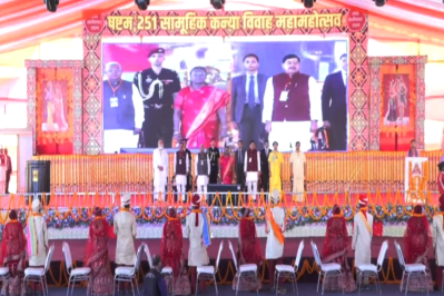 छतरपुर के खजुराहो स्थित बागेश्वर धाम में 251 जोड़ों का सामूहिक विवाह महोत्सव चल रहा है। कार्यक्रम में 251 जोड़ों को आशीर्वाद देने राष्ट्रपति द्रौपदी मुर्मू भी बागेश्वर धाम पहुंची। वे एयरफोर्स के विमान से खजुराहो एयरपोर्ट पर आईं। जहां राज्यपाल मंगूभाई पटेल और सीएम डॉ मोहन यादव ने उनका स्वागत किया। राष्ट्रपति वहां से हेलिकॉप्टर से बागेश्वर धाम पहुंचीं। जहां उन्होंने बालाजी मंदिर के दर्शन किए। दर्शन पूजन के बाद वे सामूहिक विवाह के लिए बने पंडाल के मंच पर पहुंचीं।