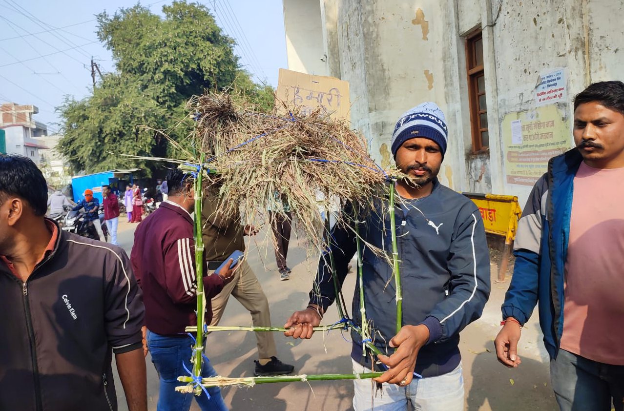 छिंदवाड़ा. कलेक्टर जनसुनवाई में उस समय अफरातफरी मच गई, जब एक ग्रामीण युवक प्रदर्शन करते हुए कांधे पर झोपड़ानुमा मकान का प्रतीक चिह्न लादे कलेक्टर कार्यालय पहुंचा। कलेक्टर परिसर में ही प्रतीक चिह्न रख दिया एवं जनसुनवाई में आवेदन दिया