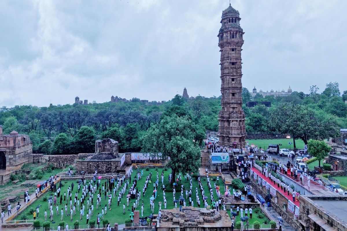 चित्तौडगढ़़. 11 वें अंतरराष्ट्रीय योग दिवस के अवसर पर जिला स्तरीय कार्यक्रम ऐतिहासिक चित्तौडगढ़़ दुर्ग पर शनिवार को हुआ। बारिश भी योगाभ्यास करने वालों का हौंसला कम नहीं कर पाई। कार्यक्रम में सार्वजनिक निर्माण, महिला एवं बाल विकास तथा बाल अधिकारिता मंत्री एवं चित्तौडगढ़़ जिले की प्रभारी मंत्री डॉ. मंजू बाघमार एवं सांसद सीपी जोशी के मुख्य आतिथ्य में हुआ। इस वर्ष योग दिवस की थीम एक पृथ्वी, एक स्वास्थ्य के लिए योग रही, जिसका उद्देश्य न केवल व्यक्तिगत स्वास्थ्य बल्कि सामाजिक और वैश्विक कल्याण में योग की भूमिका को रेखांकित करना रहा। जिले में 2,11,000 लोगों ने योगाभ्यास किया। कार्यक्रम की शुरुआत मंत्रोच्चारण और ध्यान साधना से हुई। इसके पश्चात योग प्रशिक्षकों के निर्देशन में सैकड़ों लोगों ने सामूहिक योगाभ्यास किया। इसमें सूर्य नमस्कार, प्राणायाम और विभिन्न योगासनों का अभ्यास किया। कार्यक्रम में जिले के प्रभारी सचिव राजेश कुमार यादव, जिला कलक्टर आलोक रंजन, पुलिस अधीक्षक सुधीर जोशी, एडीएम प्रभा गौतम एवं रामचंद्र खटीक, जिला परिषद के मुख्य कार्यकारी अधिकारी विनय पाठक, अतिरिक्त पुलिस अधीक्षक सरिता सिंह, रावतभाटा एडीएम विनोद कुमार मल्होत्रा सहित प्रशासनिक अधिकारी, जनप्रतिनिधि, पूर्व विधायक बद्रीलाल जाट, प्रधान देवेंद्र कंवर आदि ने भी योगाभ्यास कर सहभागिता निभाई। कार्यक्रम में विभिन्न क्षेत्रों से आए जनप्रतिनिधियों, प्रशासनिक अधिकारियों, स्कूली बच्चों, पुलिस विभाग, एनसीसी-एनएसएस स्वयंसेवकों, स्काउट-गाइड, सामाजिक संगठनों, महिला समूहों एवं आम नागरिक उपस्थित रहे।