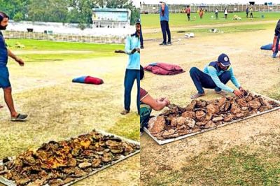 पटना के मोइनउल हक स्टेडियम में बिहार और कर्नाटक के बीच रणजी ट्रॉफी का मुकाबला खेला जा रहा है। लेकिन मैच से ज्यादा पिच के सुखाने की तरकीब पर चर्चा हो रही है। दरअसल पिच को सुखाने के लिए न पंखा, या ड्रायर का सहारा नहीं बल्कि देसी तकनीक का सहारा लिया गया। स्टेडियम में पिच को सूखा रखने के लिए गोइठा का सहारा लिया गया, जिसके उपला भी कहा जाता है। यह वही उपला या गोइठा है, जिसे जलाकर बिहार का फेमस लिट्टी चोखा बनाया जाता है। क्रिकेट के मैदान पर ऐसा नजारा शायद ही कभी देखने को मिला था। देखने को मिला जो पहले शायद ही कभी देखा गया हो।