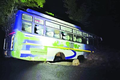 दमोह जिले के तेंदूखेड़ा में जिले में इन दिनों भारी बारिश से नदी-नाले ऊफान पर हैं। इस बीच प्रशासन ने अलर्ट जारी कर पुल-पुलियों पर पानी भरे होने पर आवागमन प्रतिबंधित किया है, लेकिन इमलिया चौकी थाना क्षेत्र में झापन और लकलका के बीच पडऩे वाले कुड़ी नाले पर बुधवार रात एक बस चालक की लापरवाही बस यात्रियों की जान पर भारी पड़ सकती थी। दरअसल बस चालक ने पुल पर पानी भरा होने के बाद भी बस निकालने की कोशिश की। बस बीच में ही बंद हो गई। बताया जाता है कि पानी के बहाव के कारण बस पुल के एक किनारे पर लटक गई। इसी बीच बस नदी के तेज बहाव में बहने ही वाली थी कि पुल के किनारे लगे छोटे-छोटे सीमेंट के पिलर के बीच में बस फंस गई। इससे एक बड़ा हादसा टल गया। यात्रियों को राहगीरों और गांव वालों की मदद से बाहर निकाला गया। बस दमोह से झलौन की ओर आ रही थी। इसमें डेढ़ दर्जन से ज्यादा यात्री सवार थे।