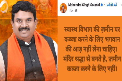 MP Mahendra Singh Solanki Facebook post: मध्य प्रदेश के देवास शहर में भाजपा की अंदरूनी गुटबाजी फिर सामने आई है। ऐसे में अनुशासन की बात करने वाली पार्टी की खेमेबाजी को लेकर फिर सवाल उठे। दरअसल सयाजी द्वार के समीप स्वास्थ्य विभाग की खाली जमीन पर नगर निगम सभापति और भाजपा नेता रवि जैन की संस्था सिद्धिविनायक द्वारा एक मंदिर बनाया गया है जहां भगवान गणेश, शिवजी और राधाकृष्ण की स्थापना आगामी दिनों में होने वाली है। इसकी तैयारियां जारी है।