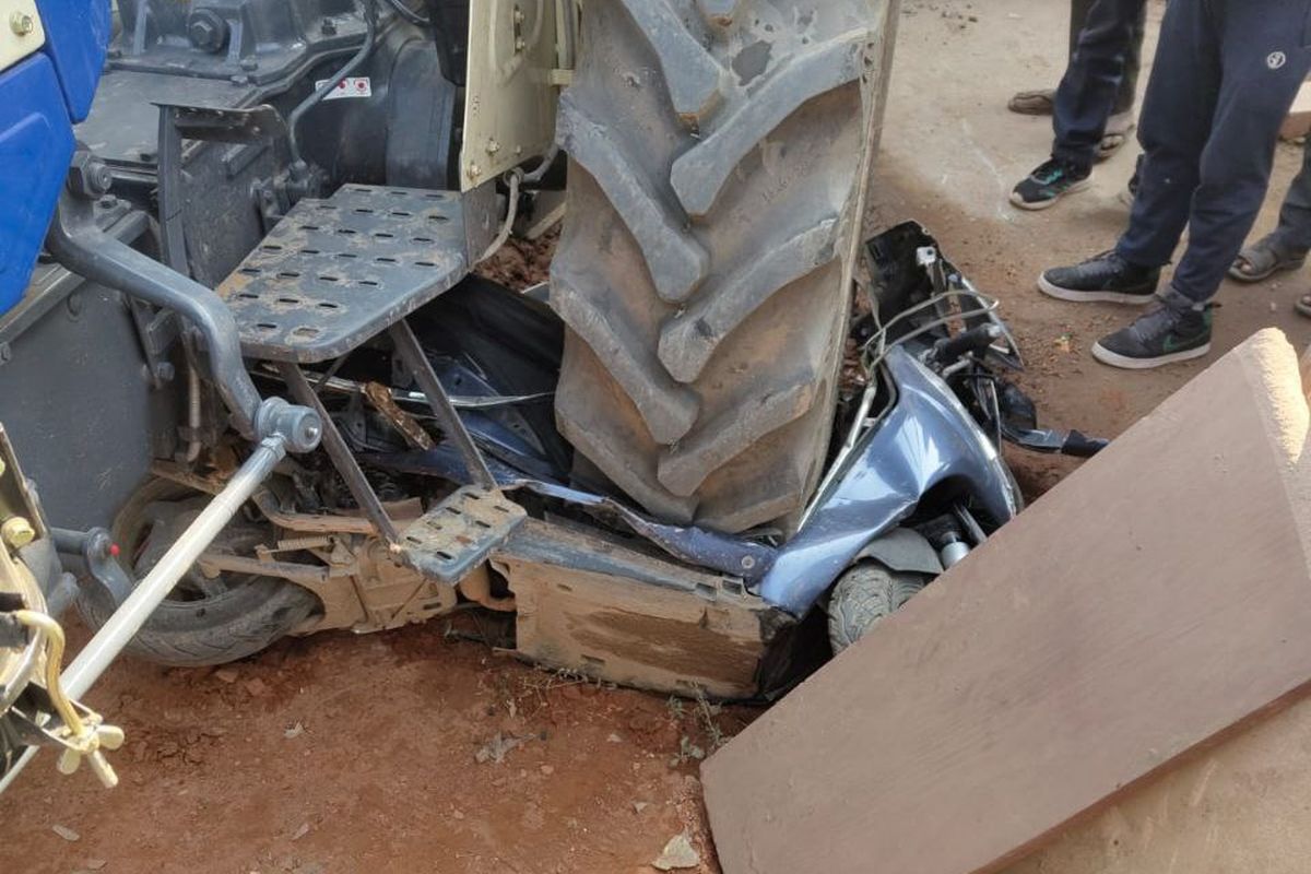 जानकारी के अनुसार ओडेला रोड पर अवैध खनिज सामग्री लेकर जा रहे ट्रेक्टर-ट्रॉली को पुलिस की डीएसटी टीम पीछा कर रही थी। पुलिस को देख चालक ने पहले ट्रेक्टर को तेज रफ्तार में भगाया लेकिन घिरता देख वह अचानक ट्रेक्टर से कूदकर भाग गया। इस दौरान देवेन्द्र नामक व्यक्ति पत्नी व बच्चे को स्कूल से स्कूटी से लेकर आ रहा था। रास्ता में वह एक दुकान पर सामान खरीदने रुक और स्कूटी सडक़ किनारे खड़ी कर दी। इस बीच अनियंत्रित ट्रेक्टर-ट्रॉली स्कूटी से जा भिड़ी, जिसमें स्कूटी पूरी तरह से क्षतिग्रस्त हो गई। हादसा देख लोग भौचक्के रह गए। लेकिन गनीमत रही कि घटना के समय स्कूटी के पास कोई नहीं था। जिससे दुर्घटना होने से टल गई।