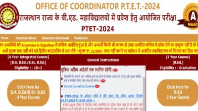 Rajasthan PTET Counselling 2024: राजस्थान पीटीईटी काउंसलिंग 2024 की मेरिट लिस्ट आ चुकी है। वर्धमान महावीर ओपन यूनिवर्सिटी ने राजस्थान प्री टीचर एजुकेशन टेस्ट (PTET) की पहली सीट अलॉटमेंट लिस्ट जारी कर दी है। अगर आपने भी PTET प्रोग्राम के लिए काउंसलिंग किया है तो आप अपना 2 वर्षीय या 4 वर्षीय रिजल्ट ऑफिशियल वेबसाइट ptetvmou2024.com पर जाकर चेक कर सकते हैं और अपना कॉलेज अलॉटमेंट लेटर डाउनलोड कर सकते हैं।