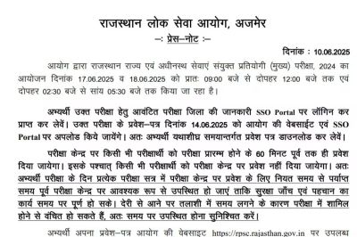 RPSC RAS Mains 2024 परीक्षा का शेड्यूल जारी। परीक्षा 17-18 जून को दो शिफ्टों में होगी। एडमिट कार्ड 14 जून से आयोग की वेबसाइट और SSO पोर्टल पर उपलब्ध होंगे।
