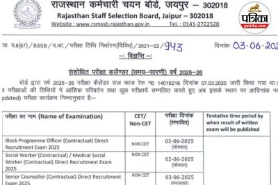 RSSB New Calendar 2025: कैलेंडर में पटवारी, ग्राम विकास अधिकारी, CET ग्रेजुएट, चतुर्थश्रेणी कर्मचारी और सीनियर सेकेंडरी लेवल की परीक्षाओं के डिटेल शामिल हैं।