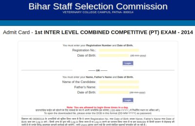 बिहार कर्मचारी चयन आयोग (BSSC) ने इंटर लेवल संयुक्त प्रतिस्पर्धी परीक्षा 2014 के लिए प्रवेश पत्र जारी कर दिए है। परीक्षा में शामिल होने वाले अभ्यर्थी आधिकारिक वेबसाइट bih.nic.in से प्रवेश पत्र डाउनलोड कर सकते हैं। अभ्यर्थी प्रवेश पत्र डाउनलोड करने के लिए रजिस्ट्रेशन नंबर और जन्म तिथि दर्ज करनी होगी।