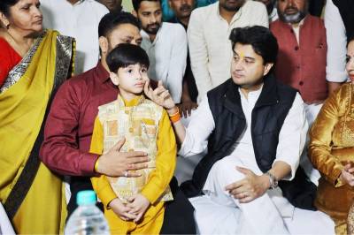 शिवाय और उसके परिवार से मिलने ग्वालियर पहुंचे ज्योतिरादित्य सिंधिया तस्वीर में बच्चे पर लाढ़ दिखाते नजर आ रहे हैं।