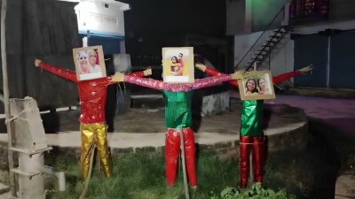 B.Tech woman burnt three effigies of her family members जयपुर के गर्ल्स हॉस्टल में नौकरी करने वाली प्रियंका बीटेक पास है। जिसका पति संजीव जयपुर में ही प्राइवेट कंपनी में नौकरी करता है। प्रियंका का मायका जालौन के रिनिया बड़गांव में है। जबकि ससुराल मुस्कुरा में है। शादी के कुछ दिन ही बीते थे कि उनके पति संजीव ननद की सहेली के साथ 'लिवइन' में रहने लगा। उसके ससुराल वाले भी पति का साथ दे रहे हैं। भगवान राम का वनवास 14 साल में खत्म हो गया था। लेकिन उनका अभी भी चल रहा है।