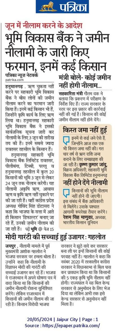 हनुमानगढ़ सहकारी भूमि विकास बैंक लिमिटेड हनुमानगढ़ के सचिव पीरदान चारण ने मीडिया को अवगत करवाया कि बैंक की ओर से जिन 20 किसानों की जमीन नीलामी की सूचना निकाली गई है। उन किसानों की कुल ऑडिट डिमांड 1126 लाख रुपए है। उन 20 किसानों की तरफ 3 करोड़ 58 लाख रुपए बकाया हैं जो कि कुल डिमांड का 32 प्रतिशत है। यह सभी 20 ऋणी वे हैं जो सक्षम होने के बावजूद बैंक का ऋण नहीं चुका रहे। बैंक की ओर से ऐसे किसी किसान की नीलामी नहीं निकाली गई है जो ऋण चुका पाने में सक्षम नहीं। इन 20 किसानों में से 10 किसान ऐसे हैं जिन्होंने ऋण लेने के बाद बैंक का एक रुपया भी वापस नहीं लौटाया। वह पूरी तरह साधन सम्पन्न हैं लेकिन वे पैसा लौटाने की मानसिकता नहीं रखते। परंतु बैंक की ओर से यह नीलामी प्रक्रिया अपरिहार्य स्थगित कर दी गई है। सहकारिता विभाग के निर्देशानुसार आगामी कार्यवाही की जाएगी। इस संबंध में जिला कलक्टर व सहकारिता विभाग के अधिकारियों को अवगत करवा दिया गया है।