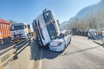 mp news: ट्राले ने कार को पीछे से टक्कर मारी और फिर कार पर ही पलट गया, कार में सवार परिवार बाल-बाल बचा।