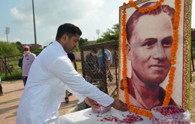 हॉकी के जादूगर मेजर ध्यानचंद के जन्मदिवस राष्ट्रीय खेल दिवस पर शनिवार को राजस्थान राज्य क्रीड़ा परिषद् द्वारा सवाई मानसिंह स्टेडियम स्थित हॉकी एस्ट्रोटर्फ मैदान पर दद्दा को याद करते हुए एक प्रदर्शन हॉकी मैच का आयोजन किया गया।