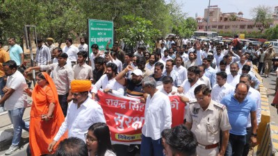 जयपुर। शिव विधायक और बाड़मेर-जैसलमेर लोकसभा सीट से निर्दलीय प्रत्याशी रविंद्र सिंह भाटी को जान से मारने की मिली धमकी के बाद श्री राजपूत सभा में आक्रोश व्याप्त हो गया। जयपुर जिला कलक्ट्रेट पर गुरुवार को श्री राजपूत सभा अध्यक्ष राम सिंह चंदलाई के नेतृत्व में समाज के सैकड़ों लोग एकत्र हुए और सरकार के खिलाफ विरोध प्रकट किया। कार्यकर्ताओं ने कलक्ट्रेट पर जमकर नारेबाजी की और सर्कल पर रैली निकाली।