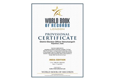 Good News : राजस्थान के हनुमानगढ़ शहर के नाम विश्व रिकॉर्ड दर्ज किया गया है। वर्ल्ड बुक ऑफ रिकॉर्ड्स लंदन से वोट पाती को प्रोविजनल सर्टिफिकेट मिला है।