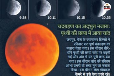 Lunar Eclipse : देश के ज्यादातर हिस्सों में रविवार रात पूर्ण चंद्रग्रहण का नजारा देखा गया। इस दौरान धीरे-धीरे पृथ्वी की छाया चांद पर बढ़ती गई और अंत में यह पूरी तरह ढक गया। इस दौरान चांद की रक्तिम आभा उभरी तो ब्लड मून का नजारा दिखा। इस दौरान लोग मोबाइल कैमरे से इसे कैद करते रहे। जयपुर में आसमां में रविवार देर रात खगोलीय घटना पूर्ण चन्द्रग्रहण के दौरान अदभुत नजारा देखने लायक रहा।