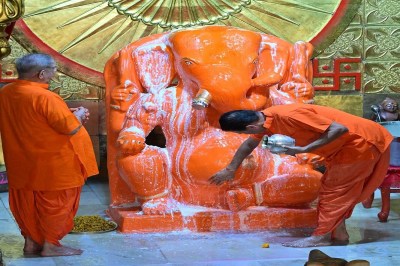 मोती डूंगरी गणेशजी मंदिर में महंत कैलाश शर्मा के सान्निध्य में भगवान गजानन का दूध, दही, घी, बूरा, शहद, केवड़ा व गुलाब जल एवं इत्र से अभिषेक किया गया। इसके बाद गंगाजल से शुद्ध स्नान करवा कर भगवान को नवीन पोशाक धारण करवाई गई। श्री गणपति सहस्त्रनाम से 1008 मोदक अर्पित किए गए।