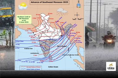 यदि आज की तारीख यानी 5 जून की बात करें, तो अभी तक दक्षिण-पश्चिम मानसून (Southwest Monsoon) महाराष्ट्र के आधा से अधिक इलाके को कवर कर चुका है। यही Southwest Monsoon राजस्थान में भी जमकर बारिश कराता है। यह अभी धीमी रफ्तार से राजस्थान की तरफ बढ़ रहा है। मौसम विभाग की तरफ से जारी किए गए आंकड़ों के मुताबिक, मध्य प्रदेश में एंट्री के साथ ही मानसून की रफ्तार बढ़ जाएगी और तेजी से राजस्थान की तरफ बढ़ेगा।