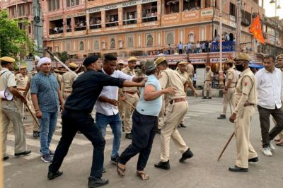नारे लगा रहे लोगों को पुलिस ने वहां से हटने को कहा लेकिन कुछ लोग नहीं माने तो पुलिस ने हल्का बल प्रयोग कर उनको खदेड़ दिया। एहतियात के तौर पर बड़ी संख्या में रामगंज, जौहरी बाजार सहित अन्य इलाकों में अतिरिक्त जाप्ता तैनात किया गया। पुलिस कमिश्नर बीजू जॉर्ज जोसफ मौके पर पहुंचे और माणक चौक थाने पहुंचकर कानून व्यवस्था के संबंध में निर्देश दिए।