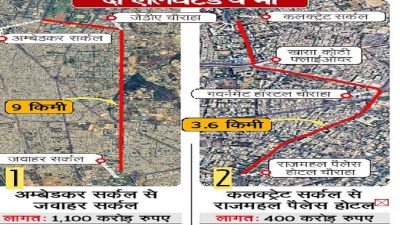एलिवेटेड: 2कलक्ट्रेट सर्कल से एमआइ रोड होते हुए राजमहल पैलेस होटल चौराहे तक 3.6 किमी की ऐलिवेटेड रोड की डीपीआर तैयार करवाई जाएगी। जेडीए इसकी फिजिबिलटी रिपोर्ट पहले ही तैयार करवा चुका है।
