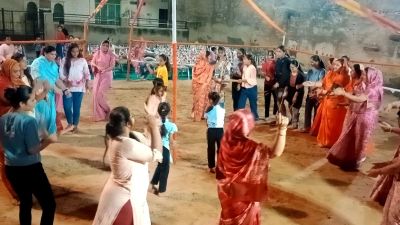 पोकरण कस्बे में शारदीय नवरात्रा के दौरान गली मोहल्लों में देर रात तक डांडियों की खनक गूंज रही है। गरबा नृत्य को लेकर महिलाओं व युवतियों में उत्साह नजर आ रहा है। कस्बे में कई जगहों पर मां दुर्गा की प्रतिमाओं की स्थापना कर पूजा-अर्चना की जा रही है। साथ ही रात के समय गरबा नृत्य का आयोजन हो रहा है। जिससे माहौल धर्ममय हो रहा है। कस्बे के गुराणियों की गली गरबा समिति के संरक्षक सुरेन्द्र केवलिया ने बताया कि अध्यक्ष प्रीति चांडक, उपाध्यक्ष दीपिका चांडक, कोषाध्यक्ष भावेश, सचिव हेमा जोशी, व्यवस्थापक उर्मिला पुरोहित की देखरेख में पूजा-अर्चना कर गरबा महोत्सव का आयोजन किया जा रहा है। रात 8 बजे गरबा नृत्य शुरू होता है, जो देर रात तक जारी रहता है। इसके अलावा कस्बे के छंगाणियों की गली, वाल्मिकी मोहल्ले सहित कई जगहों पर गरबा महोत्सव का आयोजन किया जा रहा है।