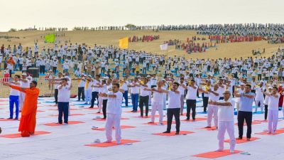 अंतरराष्ट्रीय योग दिवस के अवसर पर शनिवार को जैसलमेर जिले के खुहड़ी क्षेत्र के रेतीले धोरों पर राज्य स्तरीय समारोह आयोजित हुआ।