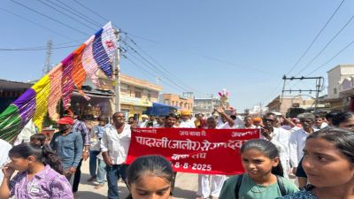 केरल के उद्योगपति व भामाशाह हाल जालौर निवासी अर्जुनसिंह पादरली लगातार 19 वें वर्ष अपने 300 समर्थकों के साथ पद यात्रा करते हुए जालौर से रामदेवरा पहुंचे। उन्होंने बाबा रामदेव की समाधि के दर्शन कर खुशहाली की कामना की। इस अवसर पर पुरुष महिला बच्चे व अन्य लोग डीजे की धुन पर नाचते कूदते हुए रामदेवरा पहुंचे। सभी ने अपने साथ लाया चांदी का ढाई किलो वजनी मुकुट बाबा की समाधि पर चढाकर विधि-विधान के साथ पूजा अर्चना की। गत 19 वर्ष से उद्योगपति भामाशाह अर्जुनसिंह रक्षाबंधन के दिन अपनी पदयात्रा शुरू कर रामदेवरा पहुंचते हैं। वह बाबा की समाधि के दर्शन कर देश में खुशहाली की कामना करते हैं। उन्होंने बताया कि बाबा रामसा पीर रामदेवरा आने वाले सभी भक्तों की आस्था व मन्नत पूर्ण करते हैं। यहां आकर सारा दु:ख दर्द मिट जाता है व असीम सुकून व शांति मिलती है। उन्होंने बताया कि जब तक उनके शरीर में क्षमता है, वे लगातार पदयात्रा करते हुए रामदेवरा पहुंचते रहेंगे। रामदेवरा पहुंचने पर बाबा रामदेव समाधि समिति पदाधिकारियों की तरफ से उनका स्वागत अभिनंदन किया गया। उन्होंने रामसरोवर तालाब परचा बावड़ी झूला पालना सहित अन्य दर्शनीय स्थान का घूम कर भ्रमण भी किया। वे प्रतिवर्ष रक्षाबंधन के उपलक्ष के आसपास रामदेवरा अवश्य पहुंचते हैं। पद यात्रा के दौरान जालौर के ग्राम वासी धर्म पत्नी व परिवारजन सहित ग्रामवासी भी उपस्थित थे।