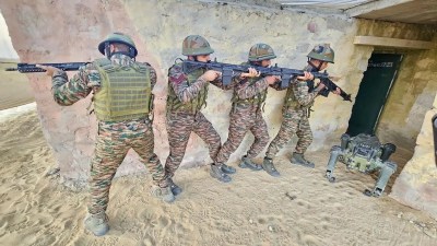 थार के रेगिस्तानी परिदृश्य में फैली जैसलमेर की सरहद पर भारतीय थल सेना हर पल सतर्क रहती है। विशाल रेगिस्तान, तेज़ धूप और ऊंची रेत की ढूहों के बीच सैनिक चौकसी, निगरानी और तत्पर कार्रवाई में लगे रहते हैं।