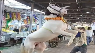 गुजरात के गोधरा से दो सफेद अश्व को लेकर एक दर्जन से अधिक भक्त रामदेवरा पहुंचे। उन्होंने बाबा रामदेव की समाधि के दर्शन किए और अपने साथ लाए सफेद अश्व को भी बाबा की समाधि के दर्शन करवा कर देश में खुशहाली की कामना को लेकर पूजा-अर्चना की। रामदेवरा पहुंचे सफेद घोड़े यहां पर सभी भक्तों के लिए काफी आकर्षक का केंद्र भी बने रहे। बाबा की समाधि के दर्शन करने आए भक्त ने बताया कि यह अश्व गोधरा में रहते हैं। पिछले दिनों गुजरात के पालनपुर में अश्व की दौड़ प्रतियोगिता का आयोजन किया गया था, जिसमें उन्होंने भी भाग लिया था। वहां पर उनके घोड़ों ने सबको पछाड़ते हुए प्रथम दो स्थान प्राप्त किए। जिन्हें लेकर वह बाबा की समाधि के दर्शन करने के लिए रामदेवरा पहुंचे हैं। इसके लिए उन्होंने विशेष रूप से एक गाड़ी में इन घोड़े को रखकर अपने साथ लेकर रामदेवरा पहुंचे। बाबा की समाधि पर विधि विधान के साथ घोड़ो की विशेष रूप से पूजा-अर्चना की गई। सफेद घोड़े ने बाबा रामदेव समाधि स्थल मुख्य प्रवेश द्वार के सामने अपने हैरत अंगेज करतब नृत्य डांस भी करके दिखाया, जो सभी लोगों के लिए काफी आकर्षक का केंद्र बना रहा।